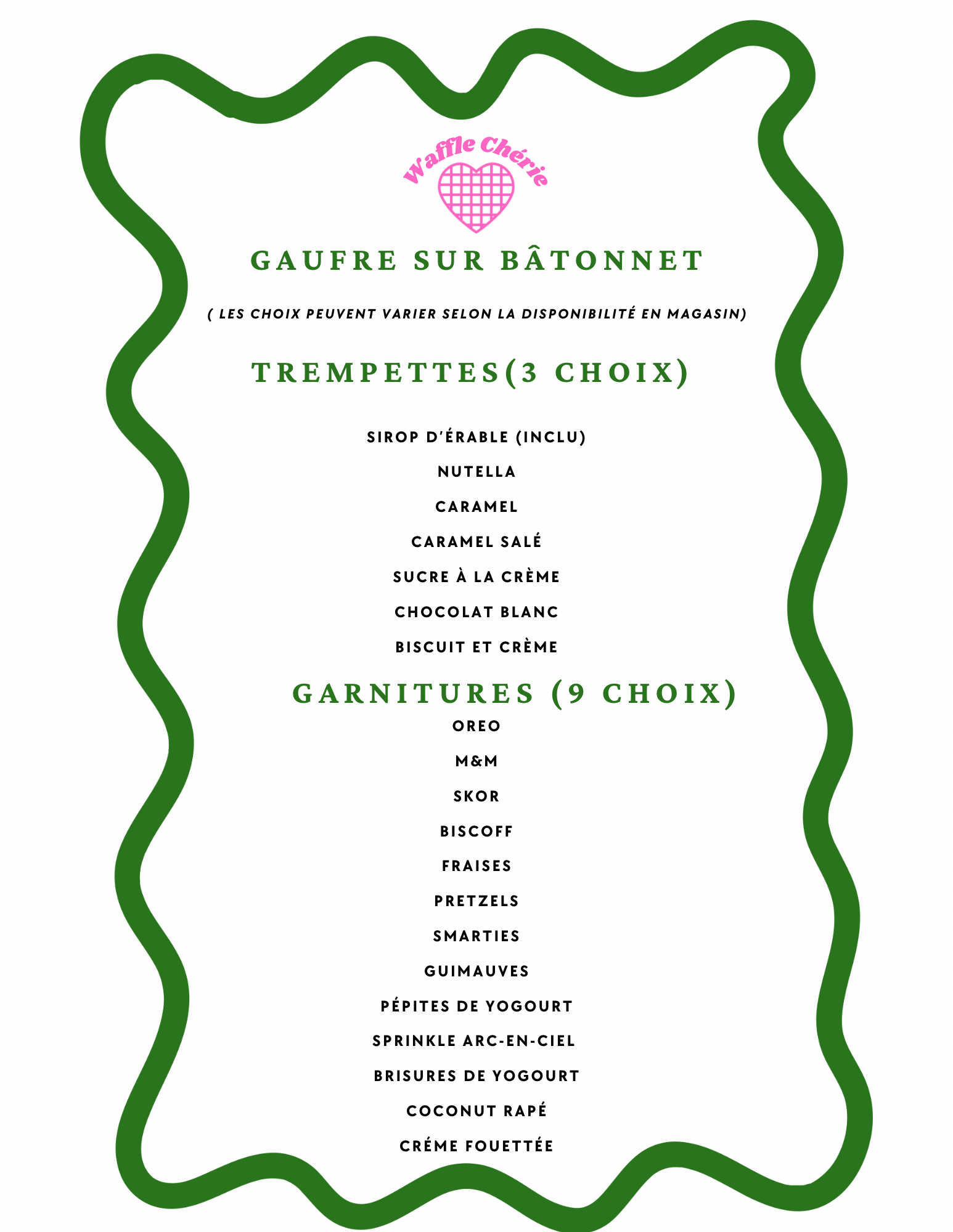 Choisissez votre style de gaufre, en cœur sur brochette ou tressée sur bâto, puis personnalisez-la avec vos saveurs préférées!