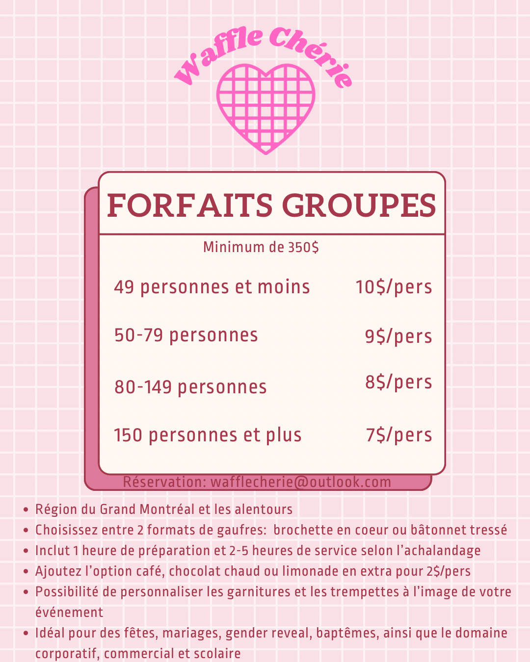 Consultez notre menu et nos tarifs, et laissez Waffle Chérie apporter une touche sucrée mémorable à votre fête, créer des souvenirs gourmands et faire briller vos invités à chaque bouchée !